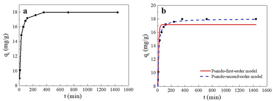 (a) Effect of contact time on the Cu(II) adsorption capacity of SC1050 and (b) pseudo-first-order and pseudo-second-order plots of Cu(II) sorption onto SC1050 (Cu(II) initial concentration = 15 mg/L, pH = 5.5, adsorption temperature = 35 °C).