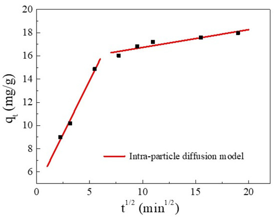 Furthermore, the kinetics and rate-limiting step of the adsorption were elucidated using the intra-particle diffusion (IPD) model. The IPD fitting curve of Cu(II) adsorption and the values of the rate constant are reported in Figure 6 and Table 4, respectively. Figure 6 shows that the plot exhibited a multi-linearity, in accordance with two stages: the first linear portion was due to the diffusion of Cu(II) through the solution to the external surface of SC1050 and the second linear portion described intra-particle diffusion [36]. The rate constant of the first stage was greater than that of the second stage (Table 4), indicating the initial adsorption was rapid surface adsorption controlled by film diffusion, and intra-particle diffusion controlled the adsorption process [35]. Additionally, the fitting plot did not intersect the origin, indicating that intra-particle diffusion was not the only rate-limiting step [33].