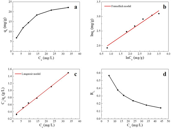 Adsorption isotherms are used to describe the relationship between the adsorbate and adsorbent at equilibrium [37]. The fitting plots and fitting parameters of Cu(II) adsorption onto SC1050 are shown in Figure 7 and Table 5, respectively, which reveal that the Langmuir model could better describe the process of Cu(II) adsorption onto SC1050 at 35 °C, indicating monolayer adsorption of Cu(II) ions onto SC1050. Furthermore, Figure 7d shows that the RL values calculated by the Langmuir model were greater than 0 but less than 1 for all initial concentrations, meaning that the adsorption process of Cu(II) onto SC1050 was favorable [1].