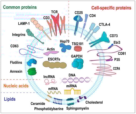 Like EVs derived from other cell types, Treg-EVs contain many common EV proteins, which are considered as universal markers. These rich protein components play essential roles in EVs biogenesis and secretion. The common proteins on the surface of extracellular vesicles include membrane transporters and fusion proteins (e.g., flotillin and annexins), tetraspanins (e.g., CD63 and CD81), cell adhesion-related proteins (e.g., integrin), lysosomal-related membrane proteins (e.g., LAMP), and some glycoproteins. The common proteins located inside extracellular vesicles include heat shock protein (e.g., HSP70), poly-vesicle biosynthesis-related proteins, endosomal sorting complex for transport (ESCRT) and its auxiliary protein components (e.g., TSG101), and cytoskeletal proteins (e.g., actin, tubulin). There are also some common metabolic enzymes (e.g., GAPDH), signaling proteins, and carrier proteins [19,30]. At present, the common EV-proteins CD63 and CD81, together with electron microscopy results, are used to identify and isolate Treg-EVs.