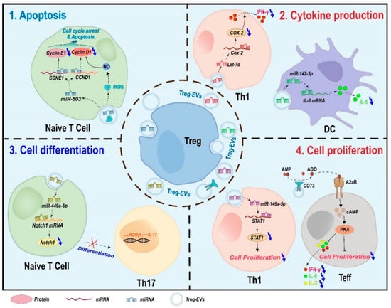 Treg-EVs can regulate target cell differentiation. EVs derived from TGF-β-induced CD4+ CD25+ Treg cells (iTreg) showed a significantly higher miR-449a-5p expression level than those from non-induced cells. iTreg-EVs inhibited Th17 differentiation by targeting the Notch1 pathway of T cells by transferring miR-449a-5 [60].
