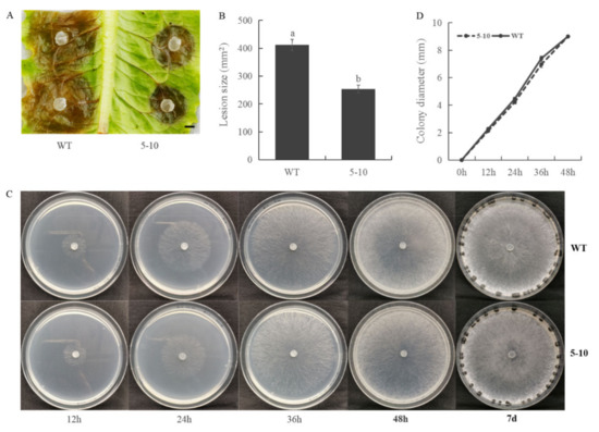 Virulence on lettuce leaves and mycelial growth phenotypes of the 5–10 mutant. (A) Necrotic lesions caused by S. sclerotiorum infection on lettuce leaves. Bar = 5 mm. Data were recorded at 36 h post-inoculation (hpi). WT: wild-type. (B) Quantification of lesion size of WT and 5–10 on lettuce leaves. ImageJ was used to quantify the lesion size. Statistical significance was analyzed using Student’s t-test between WT and the 5–10 mutant. a and b represent different significance levels. (C) Colonial morphology and mycelial growth of WT and 5–10 strains after 12 h, 24 h, 36 h, 48 h and 7 days on potato dextrose agar (PDA) media. (D) Colony diameter of WT and 5–10. Strains were grown on PDA medium and colony diameters were measured every 12 h. All experiments were conducted at least three times with similar results. Error bars represent standard error (SE). Statistical significance was analyzed using Student’s t-test between WT and the 5–10 mutant.