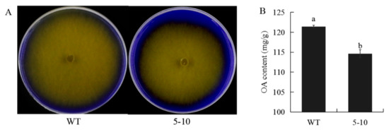 The 5–10 mutant strain produces less oxalic acid (OA). (A) Image of mycelia of WT and 5–10 grown on PDA medium containing bromophenol blue. Bar = 10 mm. (B) OA content of WT and 5–10 strains. Experiments were conducted at least three times with similar results. Error bars represent SE. Statistical significance was analyzed using Student’s t-test between WT and the 5–10 mutant. a and b represent different significance levels.