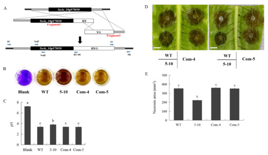 Transgenic complementation of the 5–10 mutant by Sscle_10g079050. (A) Knock-in method illustration for targeted gene complementation in S. sclerotiorum. Fragment 1 is composed of upstream sequence of the target gene genomic DNA, and the first half of hygromycin-resistance gene (HY), and Fragment 2 is composed of the second half of hygromycin-resistance gene (YG) and downstream sequence of the target gene. Once transformed into protoplasts, the two fragments replace the target gene with wild-type genomic DNA by homologous recombination. (B) Color change in WT, 5–10, and Sscle_10g079050 independent transgene complementation lines (Com-4 and Com-5) grown in PDB medium containing bromophenol blue indicator 48 hpi. (C) pH of WT, 5–10 and Com-4 and Com-5 lines after 48 hpi in PDB medium. (D) Lesions caused by S. sclerotiorum infection on lettuce leaves by the indicated fungal strains. Bar = 10 mm. Experiments were conducted at least three times with similar results. Data were recorded at 36 h post-inoculation (hpi). (E) Quantification of lesion size of WT, 5–10, Com-4 and Com-5 lines on lettuce leaves. ImageJ was used to analyze lesion size. Error bars represent SE. Statistical significance was analyzed using Student’s t-test. a, b and c represent different significance levels.