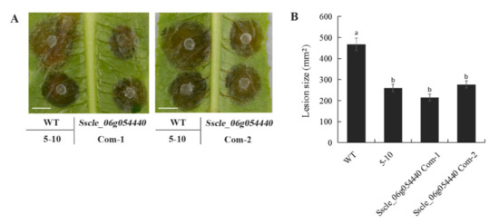 Sscle_06g054440 failed to complement the defects of 5–10. (A) Necrotic lesions on lettuce leaf due to S.sclerotiorum infection by the indicated strains. Bar = 10 mm. Data were recorded at 36 h post-inoculation (hpi). (B) Quantification of the lesion size of WT, 5–10, Sscle_06g054440 transgenic lines on lettuce leaves. ImageJ was used to analyze lesion size. Error bars represent SE. Statistical significance was analyzed using Student’s t-test. a and b represent different significance levels.