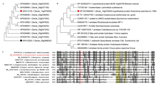 To investigate the function of Sscle_10g079050 (protein accession number, APA13135.1/XP001584936.1), homology alignment and phylogenetic analysis were conducted within S. sclerotiorum (Figure 5A). This gene appears to be a member of a large gene family, and the highest identity with its paralogous protein (Sscle_04g033530) was only 42.34%. Phylogenetic analysis among multiple species indicated that the transcripts of Sscle_10g079050 were conserved in fungi (Figure 5B,C). Based on the annotation of its homologous proteins, Sscle_10g079050 was predicted to possess a function of amidase or acetamidase. The point mutation in 5–10 caused an amino acid to change from Leucine to Serine (L82S) and this Leu is conserved in fungi, especially in Leotiomycetes (Figure 5C), suggesting a critical role of this residue to its function. As Sscle_10g079050 encodes an enzyme catalyzing the hydrolysis of an unknown amide, it does not seem to be directly involved in OA biosynthesis or catabolism. It likely affects the OA level through indirect means.