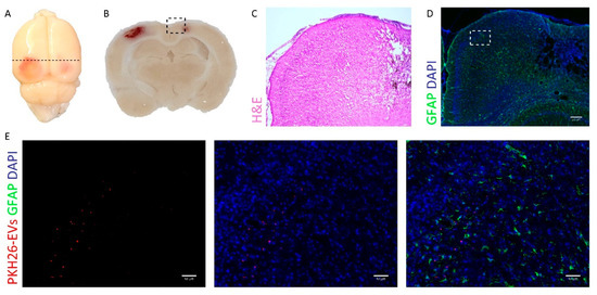 PKH26-labeled extracellular vesicles (EVs) accumulate in lesion sites in brains of the SBH/y model of cerebral small vessel disease (CSVD). Representative images of brain derived from SBH/y-DS rats following a single administration of PKH26-labeled EVs (A). Dashed lines represent the coronal section presented in (B). 5× magnification of the injured area is presented using H&E (C) and GFAP immunostaining (D). Scale bar = 200 µm. A magnification of the inset in (D) is presented in (E). PKH26 labeled EVs are shown in red. Scale bar = 50 µm.