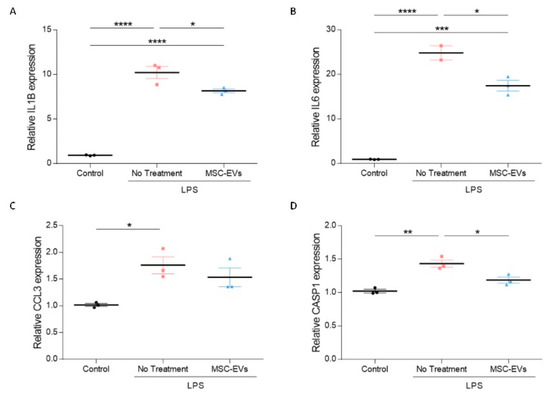 Considering MSC-EV proximity to reactive astrocytes, and the general notion that migration of MSC-EVs is driven by inflammation [13,25], MSC-EV effects on immune system responses were assessed in vitro. Microglia BV2 cells were stimulated using lipopolysaccharide (LPS), as a model for an inflammatory environment in the brain [26]. Treatment with MSC-EVs significantly diminished expression level of the pro-inflammatory mediators Il1β, Il6, and to some extent moderated Ccl3 expression (Figure 2A–C). MSC-EV treatment also significantly reduced the inflammatory mediated caspase, Casp1 (Figure 2D), further supporting the anti-inflammatory activity of MSC-EVs, and reduction in pro-inflammatory cytokines in particular.