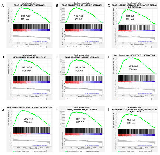 Gene Set Enrichment Analysis (GSEA) in the SBH/y model of cerebral small vessel disease (CSVD). GSEA of differential expression between SBH/y- DS (n = 4) and SBH/y sham (n = 4) demonstrates that the following gene sets were upregulated in our model: inflammatory response (A), regulation of immune response (B), immune response regulating signaling pathway (C), innate (D) and adaptive (E) immune response, T cell activation (F), cytokine production (G), lymphocyte activation (H), and positive regulation of immune system process (I). Green curves show the accumulating enrichment score. Normalized enrichment score (NES) and false discovery ratio (FDR) are shown for each gene set analyzed.