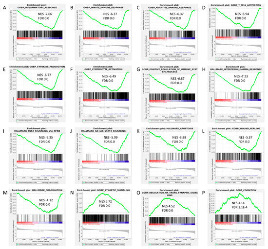 Gene Set Enrichment Analysis (GSEA) in mesenchymal stem cell-derived extracellular vesicle (MSC-EV)-treated SBH/y-DS rats. GSEA of differential expression between MSC-EV treated (n = 4) and untreated (n = 4) SBH/y-DS rats demonstrates that the following gene sets were downregulated in the treated rats: inflammatory response (A), innate (B) and adaptive (C) immune response, T cell activation (D), cytokine production (E), lymphocyte activation (F), positive regulation of immune system process (G), interferon gamma response (H), TNF signaling via NFκB (I), IL6-JAK-STAT3 signaling (J), apoptosis (K), wound healing (L), and coagulation (M). Furthermore, the following gene sets were upregulated in the treated rats: synaptic signaling (N), regulation of trans-synaptic signaling (O), and cognition (P). Green curves show the accumulating enrichment. Normalized enrichment score (NES) and false discovery ratio (FDR) are shown for each gene set analyzed.