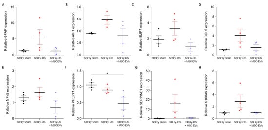 mRNA alternations between SBH/y sham, SBH/y-DS, and mesenchymal stem cell-derived extracellular vesicle- (MSC-EV) treated SBH/y-DS rats. mRNA expression analysis of Gfap (A), Aif1 (B), Bmp7 (C), Ccl5 (D), Nfκb (E), Phlpp1 (F), Serpine1 (G), and S100a6 (H) in rats’ cortices (n = 4) (primers are listed in Table 1). Data are presented as mean ± SEM, * p < 0.05, one-way ANOVA.
