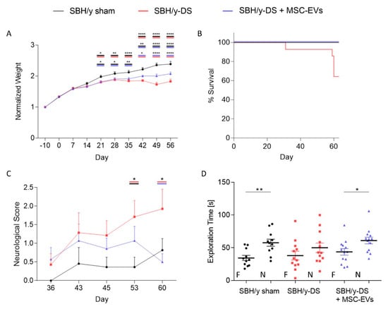 Mesenchymal stem cell-derived extracellular vesicle- (MSC-EV) treatment improved clinical features and cognitive deficits in SBH/y-DS rats. Growth rate of the animals normalized to baseline body weight (A). Kaplan-Meier survival curve (B). Neurological score assessment starting from day 36 was performed using serial neurological examinations, including assessment of walking, forelimb and hindlimb flexion, balance beam, placing test, corneal and startle reflex, myoclonus, myodystonia and shaking (C). The novel object recognition (NOR) task was performed to evaluate recognition memory (D). The time spent exploring the familiar (F) and novel (N) objects is presented. Data are presented as mean ± SEM, (A,C) * p < 0.05, ** p < 0.01, **** p < 0.0001, two-way ANOVA; (D) * p < 0.05, ** p < 0.01, two-tailed t-test.
