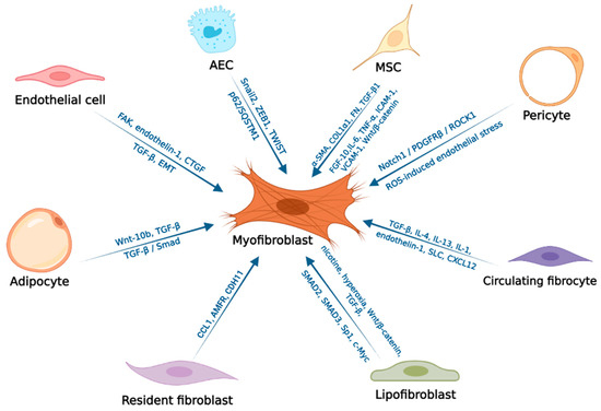 Pathways of myofibroblast formation during IPF. The figure shows the different cell types that respond to stimulation by profibrotic growth factors (TGF-β, CTGF), cytokines (IL-1, IL-13, IL-4, IL-6, TNF-α), signaling pathways (Wnt/β-catenin, Notch1/PDGFRβ/ROCK1), chemokines (CXCL12, SLC, CCL1), specific EMT transcription factors (Snail2, ZEB1, TWIST, p62/SQSTM1), adhesion molecules (ICAM-1,VCAM-1, FAK and CDH-11), hyperoxia, exposure to endothelin-1 and nicotine, overexpression of α-SMA, COL1α1 and fibronectin, upregulation of SMAD2, SMAD3, Sp1 and c-Myc differentiated into myofibroblasts [65,70,76,77,78,79,80,81,82,83,84,85,86,87,88,89,90,91,92,93,94,95,96,97,98,99,100,101,102] (Created with BioRender.com, accessed on 4 July 2022).