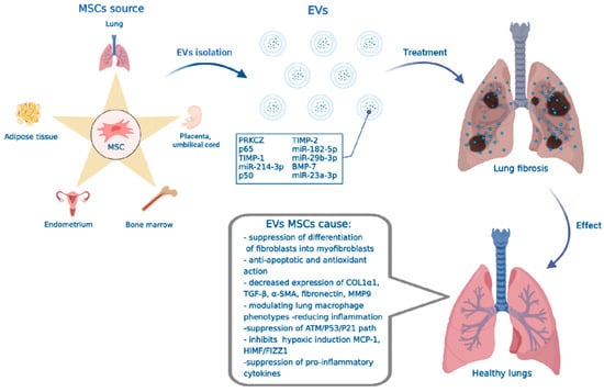 The mechanism of idiopathic pulmonary fibrosis involves a complex interaction of different cell types, factors and signaling pathways. To date, there is a problem with the effectiveness of the applied methods of IPF therapy. Mesenchymal stem cells are the most attractive candidates because they are effective in repairing lung tissue, reducing collagen deposition, suppressing profibrotic genes, inhibiting pro-inflammatory transcripts, and inducing myofibroblast apoptosis. However, the limitations of their use have forced the search for alternative cell-free therapies. EVs-MSCs exhibit the properties of parental cells, promote lung tissue repair and have been confirmed to be safe in clinical trials.