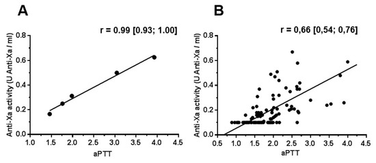 Figure 1. Correlation between aPTT and anti-Xa activity in a spiked normal plasma pool (A) and in ICU patients (B). Data are presented as Pearson coefficient with 95% confidence interval. aPTT: activated partial thromboplastin time.