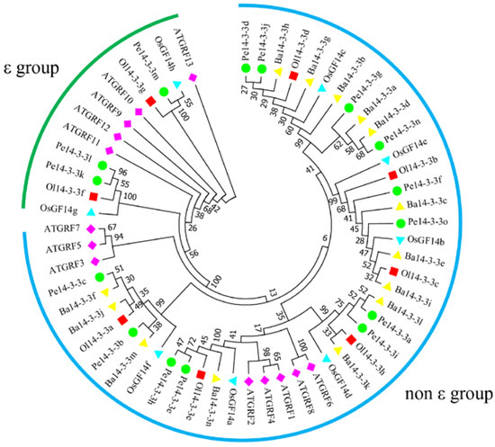 Phylogenetic tree of 14-3-3s in five plant species (At: A. thaliana; Ba: B. amplexicaulis; Ol: O. latifolia; Os: O. sativa; Pe: P. edulis). The phylogenetic tree was constructed via the maximum-likelihood (ML) method (1000 bootstrap replicates) using MEGA 7.0 software. The different numbers at nodes represent the bootstrap values for homologous genes. Purple prismatic: A. thaliana; yellow triangle: B. amplexicaulis; red square: O. latifolia; blue triangle: O. sativa; green circle: P. edulis; green and blue arcs: ε and non-ε groups.