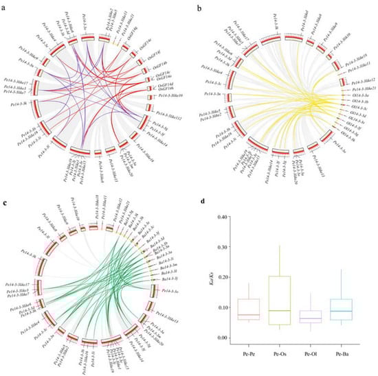 Collinearity of 14-3-3 genes in P. edulis and four other plants (Ba: B. amplexicaulis; Ol: O. latifolia; Os: O. sativa; Pe. P. edulis). (a) Collinearity among Pe14-3-3s (blue lines) and that between Pe14-3-3s and Os14-3-3s (red lines). (b) Collinearity of Pe14-3-3s and Ol14-3-3s (yellow lines). (c) Collinearity of Pe14-3-3s and Ba14-3-3s (green lines). (d) Boxplot statistics of Ka/Ks values of the 14-3-3 orthologous gene pairs within P. edulis and those between P. edulis and other three species.