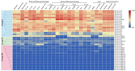To reveal the role of Pe14-3-3s, we investigated their spatiotemporal expression patterns based on the published transcriptome data [28], and an expression heatmap was drawn (Figure 3). The results showed that Pe14-3-3s exhibited a tissue-specific expression and were further divided into three groups. In group I, 16 Pe14-3-3s were nearly highly expressed in all the samples of moso bamboo and showed different expression patterns. For example, some members presented a constitutive expression pattern, such as Pe14-3-3g and Pe14-3-3i, suggesting that they played an important role in different tissues during growth and development. Some members, such as Pel4-4-3b/c/a/d/f/like1, had similar patterns both in roots and shoots at different growth stages, and were highly expressed in the top part of the roots, shoots and buds, suggesting that these genes played an important role in different growth stages, especially involved in the development of actively differentiated tissues. Meanwhile, Pe14-3-3k and Pe14-3-3l were highly expressed in specific tissues, including rhizome roots with a 0.5 cm length, the tip of bamboo shoots and the buds, suggesting that they might function in particular tissues. Of 36 genes, 5 Pe14-3-3s belonged to group II, which was only expressed in certain tissues and had a very low expression level, such as Pe14-3-3like7, which was expressed relatively higher in rhizome roots with a 10 cm length and leaf sheath. In group III, the remaining 14 Pe14-3-3s, except Pe14-3-3n, could hardly be detected in all tissues, suggesting that they may be functionally redundant genes.