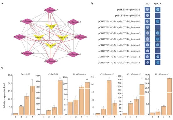 Relationship validation of Pe14-3-3s and Pe_ribosomes. (a) The co-expression network of four Pe14-3-3s with eight Pe_ribosomes, which had a strong correlation (PCC > 0.75, p-value < 0.05). The black and red lines indicate the co-expression relationship within Pe_ribosomes and those between Pe_ribosomes and Pe14-3-3s, respectively. (b) Y2H assay between Pe14-3-3b/d and Pe_ribosomes. Positive control, co-transformation with pGBKT7-53 and pGADT7-T; negative control, co-transformation with pGBKT7-Lam and pGADT7-T; DDO: SD/-Leu/-Trp, QDO/X: SD/-Ade/-His/-Leu/-Trp supplemented with X-α-Gal. (c) Expression analysis of Pe14-3-3b/d and four Pe_ribosomes in shoots with different heights (1: 0.5 m, 2: 1.0 m, 3: 4.0 m, 4: 6.0 m; the asterisks indicate the significant difference between the relative expression levels in different height shoots and that in 0.5 m shoots, * p < 0.05 and ** p < 0.01).