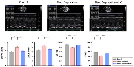 A decrease in an individual’s sleep duration is not only a core manifestation of mania but also a trigger for a manic episode [,]. Alterations in rapid eye movement (REM) density were observed in manic patients with reduced sleep []. Such changes in sleep architecture are recognized as a neurophysiological signature in individuals with bipolar disorder. In the laboratory, rats deprived of REM sleep have been well-established to induce manic-like behaviors over decades [,,]. Moreover, rats deprived of REM sleep have been shown to aggravate profibrotic signaling [,], as well as numerous cardiac abnormalities, including myocardial hypertrophy, interstitial fibrosis, and pumping failure [,]. Activation of profibrotic signaling plays a role in the pathogenesis of heart failure in patients with bipolar disorder. Thus, studying lithium’s effect on profibrotic signaling in REM sleep-deprived hearts might have translational relevance to the clinical scenario [,].