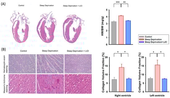 Cardiac morphology, histology, and fibrotic severity in REM sleep deprivation with and without lithium treatment. (A) Gross examination of a heart and its four-chamber view histology stained with Masson’s trichrome staining. The four-chamber view histology revealed that the REM sleep-deprived rats exhibited greater ventricular hypertrophy than did the control and lithium-treated REM sleep-deprived rats. The heart-to-body weight ratios were higher in the REM sleep-deprived rats (n = 3) than in the control (n = 3) and lithium-treated REM sleep-deprived (n = 3) rats. (B) The upper and lower panels show hematoxylin–eosin staining (original magnification, ×200) and Masson’s trichrome staining (original magnification, ×400) over the ventricles, respectively. The REM sleep-deprived rats (n = 3) exhibited a greater increase in fibrosis compared with the control (n = 3) and lithium-treated REM sleep-deprived (n = 3) rats. Fibrosis severity levels are expressed as collagen volume fractions. * p < 0.05; ** p < 0.01; *** p < 0.001.