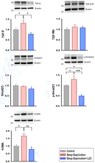 Transforming growth factor beta (TGF-β) signaling pathway in REM sleep deprivation with and without lithium treatment. The REM sleep-deprived hearts (n = 5) had greater expression levels of TGF-β, phosphorylated Smad 2/3, and α-smooth muscle actin (α-SMA) compared with the control (n = 5) and lithium-treated REM sleep-deprived (n = 5) hearts. * p < 0.05; ** p < 0.01; *** p < 0.001.