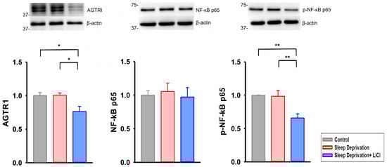 Angiotensin II cascade in REM sleep deprivation with and without lithium treatment. Compared with the REM sleep-deprived hearts (n = 5), the lithium-treated REM sleep-deprived hearts (n = 5) had lower expression levels of angiotensin II receptor type 1 (AGTR1) and phosphorylated nuclear factor kappa B (NF-κB) p65. * p < 0.05; ** p < 0.01.