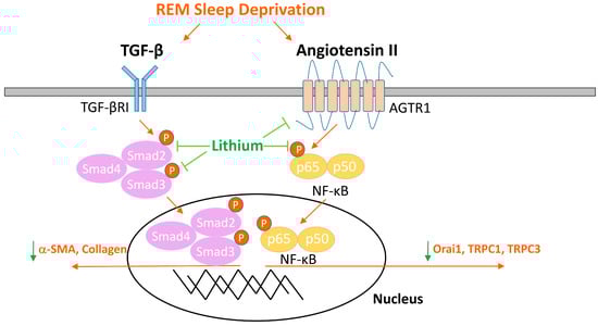 TGF-β is another crucial mediator of cardiac fibrogenesis [,]. Upon binding to the TGF-β receptor, TGF-β signaling induces the phosphorylation of Smad2 and Smad3 to form a complex with Smad4 []. Subsequently, the Smad2/3/4 complex translocates into the nucleus and activates the expression of profibrotic genes, including the myofibroblast differentiation marker α-SMA [,]. In the present study, we discovered that lithium treatment decreased the expression levels of TGF-β, phosphorylated Smad 2/3, and α-SMA in REM sleep-deprived hearts. The findings suggest that lithium treatment may alleviate cardiac fibrogenesis in individuals with REM sleep deprivation through its inhibitory effect on TGF-β signaling. Considering that angiotensin II also stimulates TGF-β released from fibroblasts [,], future mechanistic studies need to elucidate whether lithium inhibits TGF-β pathway in REM sleep-deprived hearts through the inhibition of angiotensin II signaling. As summarized in Figure 6, lithium treatment may improve ventricular contractibility and ameliorate cardiac fibrosis in REM sleep-deprived rats via blocking the activation of TGF-β and angiotensin II signaling and reducing store-operated Ca2+ entry.