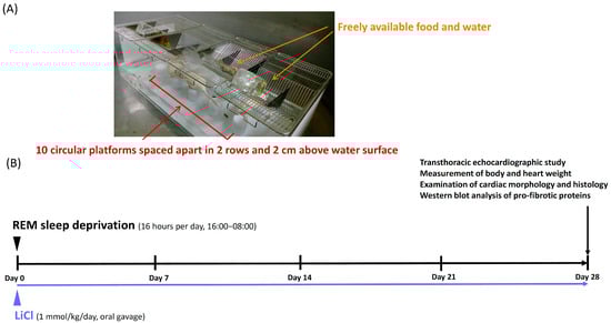 Each rat was randomly assigned to one of the following three groups: (a) control, (b) REM sleep deprivation without lithium treatment, and (c) REM sleep deprivation with lithium treatment. The REM sleep deprivation procedure was performed using the modified multiple platform method, which consisted of placing the rats inside a water tank of the following dimensions: 100 cm (length) × 45 cm (width) × 30 cm (height) (Figure 7A). The water tank contained 10 circular platforms positioned in two rows. Each platform was 6 cm in diameter, separated from the other platforms in its row by 8 cm on each side, 10-cm high, and fixed to the bottom of the tank. Throughout the study period, food and drinking water were freely available to the rats. The water level in the tank was maintained at 2 cm below the platforms, and this water was changed daily. This experimental design enabled the rats to move around inside the tank by jumping from one platform to another during their waking hours. The idea underlying the experimental design was that the rats would fall off their platforms during REM sleep because of muscle atonia and would wake up upon contact with the water, resulting in the deprivation of REM sleep. The rats in the REM sleep deprivation group were subjected to such deprivation for 16 h per day (16:00−08:00) over 4 weeks. For the remaining 8 h (8:00−16:00), the rats were transferred back to their home cages. For the group with lithium treatment, LiCl (#62476; Sigma-Aldrich, St. Louis, MO, USA) at a dosage of 1 mmol/kg was administered by oral gavage once a day for 4 weeks (Figure 7B). This dosage was chosen based on the literature [,].