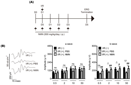 Retinal functional changes by nicotinamide mononucleotide (NMN) treatment in mice. (A) The schematic illustration shows whole experimental plans for NMN injection, retinal ischemia/reperfusion (I/R) injury, and the termination day of the whole experiment. i.p., intraperitoneal; D, day; ERG, electroretinography. (B) Representative waveforms (50 cd·s/m2) of ERG (n = 5–6 per group) demonstrated that the ERG amplitudes decreased 5 days after retinal I/R injury. NMN injection suppressed reductions in the ERG amplitude (especially b-wave), flashed with various intensities (0.5, 2, 10, or 50 cd·s/m2). * p < 0.05, *** p < 0.001, # p < 0.05, and ## p < 0.01. ns, not significant. The data were analyzed using one-way ANOVA followed by a Bonferroni post-hoc test. The data are drawn as the mean ± standard deviation.