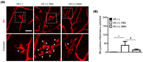 Previously, we found pathologic increases in isolectin GS-IB4 (IB4)-positive inflammatory cells in the retina five days after retinal I/R injury [13]. Therefore, we examined whether the likelihood of its occurrence could be lessened by NMN treatment (Figure 2A,B). In our current system, the number of IB4-positive inflammatory cells in the ischemic retina was markedly reduced by NMN treatment.