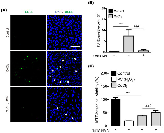 To further determine whether NMN treatment could show protective effects in retinal neuronal cells, we applied an in vitro system to our current study (Figure 3). 661W cells, a mouse-derived photoreceptor cell line possessing features of retinal ganglion precursor-like cells, were used, as they are generally used as one of the in vitro models for studying retinal degeneration [14,15,16]. Previously, we found that CoCl2-induced oxidative stress could cause 661W cell death [17]. In our current system, we also found 661W cell death by CoCl2-induced oxidative stress, analyzed with TUNEL assay (Figure 3A,B). NMN treatment significantly reduced oxidative stress-induced 661W cell death. This outcome was further confirmed with MTT assay (Figure 3C).