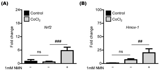 NMN treatment has been shown to increase antioxidant genes such as Nrf2 and Hmox-1 in various cell types [9,10,11,18,19]. Thus, we applied its concept to our current system (Figure 4). Under the same conditions of CoCl2-induced oxidative stress above, we found that the expression of Nrf2 and Hmox-1 mRNA was markedly increased by NMN treatment in 661W cells (Figure 4A,B).
