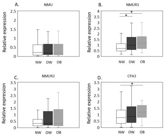 Expression of CPA3 and NMU/NMURs in the synovial membrane of normal-weight, overweight, and obese groups. The expression of NMU/NMURs and CPA3 mRNA in NW, OW, and OB groups was estimated by qPCR (A–D). NMU (A), NMUR1 (B), NMUR2 (C), and CPA3 (D) mRNA expression in the synovial membrane of normal-weight (NW, n = 79), overweight (OW, n = 87), and obese (OB, n = 40) patients with knee osteoarthritis. Gene expression is presented in box and whisker plots, showing the median, 25th, and 75th percentiles and range. * p < 0.05.