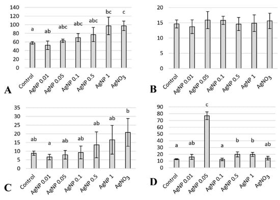 Another issue under investigation is the role of the CYP1A protein in modulating the body’s response to silver nanoparticle exposure. In the current study, the AgNP and AgNO3 exposure had no effect on the cyp1a expression. A similar lack of a relationship between exposure to silver nanoparticles and the cyp1a2 gene expression in rainbow trout livers was shown by Scown et al. []. This may indicate a lack of strong stimulation of the phase I biotransformation during the detoxification of organs exposed to aqueous solutions of silver nanoparticles.