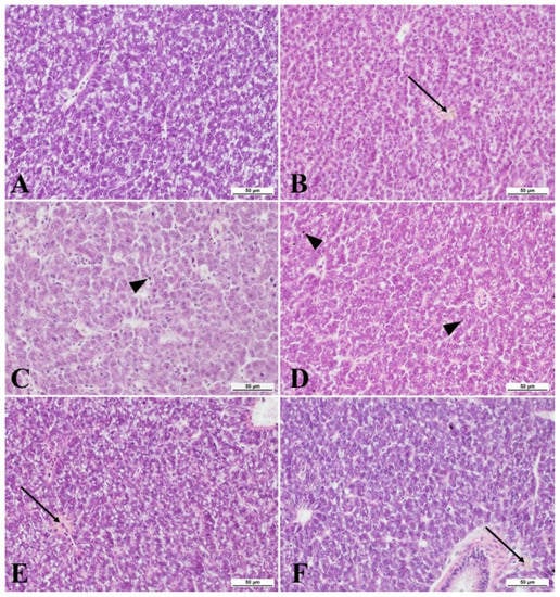A cross-section of zebrafish livers from the control group (A) and when exposed to: (B) AgNP solution at 0.01 mg/dm3; (C) AgNPs at 0.05 mg/dm3; (D) AgNPs at 0.1 mg/dm3; (E) AgNP at 1.0 mg/dm3; and (F) AgNO3 at 0.01 mg/dm3. Arrow: melanomacrophage centers. Arrowhead: macrophages with nanoparticle deposition. HE staining performed. Scale bars 50 µm.