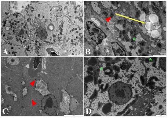 Ultrastructure of zebrafish hepatocytes from the control group (A) and when exposed to: (B) AgNPs at 0.05 mg/dm3, (C) AgNPs at 1.0 mg/dm3, (D) AgNO3 at 0.01 mg/dm3. Arrow: myelin bodies. Arrowhead: nanoparticle deposition. * Mitochondria with an abnormal shape. Scale bars in photo (A,C): 5 µm; in photo (B,D): 2 µm.