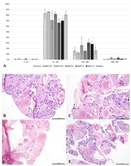 Distribution of oocyte diameter (mean values ± SD) of zebrafish from all experimental groups (A). Cross-section through the female gonad of zebrafish from the experimental groups: (B) control group, (C) AgNPs at 0.01 mg/dm3, (D) AgNPs at 1.0 mg/dm3, and (E) AgNO3 at 0.01 mg/dm3. HE staining performed. Scale bars: 500 µm.