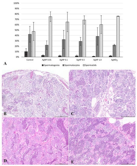 Percentage (mean values ± SD) of spermatogonia, spermatocytes, and spermatids in the testes of zebrafish from the experimental groups (A). The cross-section through the male gonad of zebrafish from the experimental groups: control group, (B) AgNPs at 0.01 mg/dm3, (C) AgNPs at 0.1 mg/dm3, and (D) AgNO3 at 0.01 mg/dm3 (E). HE staining performed. Scale bars: 500 µm.