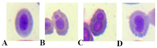 Micronucleus test. Erythrocytes of fish from different groups: (A) Control group (normal erythrocyte), (B) AgNPs at 1.0 mg/dm3 (erythrocyte with micronucleus), (C) AgNPs at 0.5 mg/dm3 (erythrocyte with segmented nucleus), (D) AgNPs at 0.01 mg/dm3 (erythrocyte with a kidney shape: reniform). MGG staining performed. Magnification: 1000×.