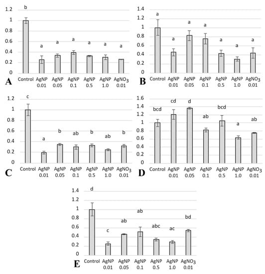 The gene expression analysis of oxidative stress markers (cat, gpx1a, gsr, and sod1) and phase I biotransformation markers (cyp1a) in the liver of zebrafish showed changes in the amount of tested transcripts, depending on the concentration of the tested xenobiotic. Exposure of fish to the tested xenobiotics resulted in statistically significant lower expression levels of cat, gpx1a, and sod1 in the livers of fish from the tested groups compared with the control group (Figure 7). There were no statistically significant differences in the expression of cyp1a in the livers of the tested fish (Figure 7). In contrast, it was found that fish exposed to 0.05 mg/dm3 had higher level of gsr gene expression compared with the AgNP 1.0 mg/dm3 group, and the difference was found to be statistically significant (Figure 7). In the AgNP 1.0 mg/dm3 experimental group, gsr expression levels were lower than in the control group. The highest level of gsr expression was found in the livers of fish from the AgNP 0.05 mg/dm3 group, while the lowest level was found in the AgNP 1.0 mg/dm3 group, and the differences were statistically significant (Figure 7).