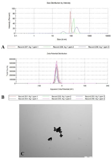 The parameters and shape of the silver nanoparticles used in the experiment: (A) size distribution, (B) zeta potential distribution (mV), and (C) morphology of silver nanoparticle aggregates. Scale bar: 0.2 µm.