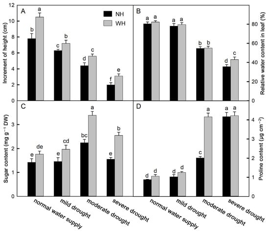 Height, content of proline, and soluble sugar and leaf relative water. Effects of water and host on height change (A) (means ± SE, n = 10), leaf relative water content (B), soluble sugar (C), and proline (D) content of S. album seedling leaves (means ± SE, n = 5). NH, grown without host; WH, grown with host. Different letters above bars indicate statistical significance (p < 0.05).