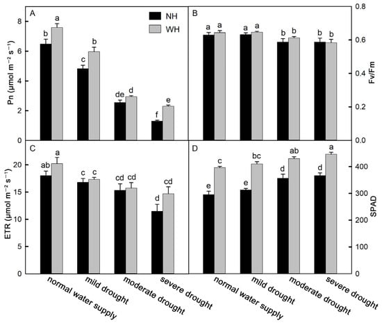 Net photosynthetic rate, maximum photochemical efficiency, electron current transfer rate, and SPAD. Effects of water and host on net photosynthetic rate (Pn, (A)), maximum photochemical efficiency (Fv/Fm, (B)), electron current transfer rate (ETR, (C)), and SPAD (D) of S. album seedling leaves (means ± SE, n = 10). NH, grown without host; WH, grown with host. Different letters above bars indicate statistical significance (p < 0.05).
