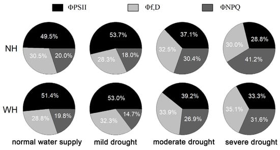 Light energy distribution in leaves of S. album. Effects of water and host on light energy distribution of S. album seedling leaves (n = 10). NH, grown without host; WH, grown with host.