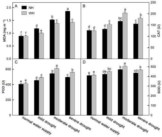 Malondialdehyde (MDA) content and antioxidant enzyme activity. Effects of water and host on MDA content (A), activities of catalase (CAT, (B)), peroxidase (POD, (C)), and superoxide dismutase (SOD, (D)) of S. album seedling leaves (means ± SE, n = 5). NH, grown without host; WH, grown with host. Different letters above bars indicate statistical significance (p < 0.05).