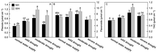 Difference of phenolic and flavonoid contents and total antioxidant capacity. Effects of water and host on content of phenols (A) and flavonoids (B), and total antioxidant capacity (TAC, (C)) of S. album seedling leaves (means ± SE, n = 5). NH, grown without host; WH, grown with host. Different letters above bars indicate statistical significance (p < 0.05).