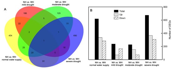 Number of differentially expressed genes (DEGs). Venn diagram showing the number of DEGs (A) and uumber of DEGs up-regulated and down-regulated (B) between grown without host (NH) and grown with host (WH) under normal water supply, mild drought stress, moderate drought stress, and severe drought stress conditions.