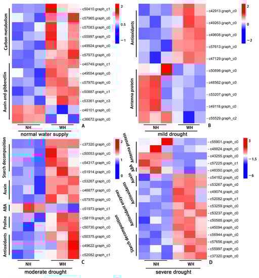 Heatmap of gene expression. Gene expression between grown without host (NH) and grown with host (WH) under normal water supply (A), mild drought stress (B), moderate drought stress (C), and severe drought stress (D) conditions.