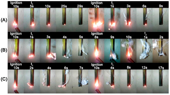 Video screenshots of a vertical burning test of 1%HPDAl/EP (A); 2%HPDAl/EP (B); and 3%HPDAl/EP (C).